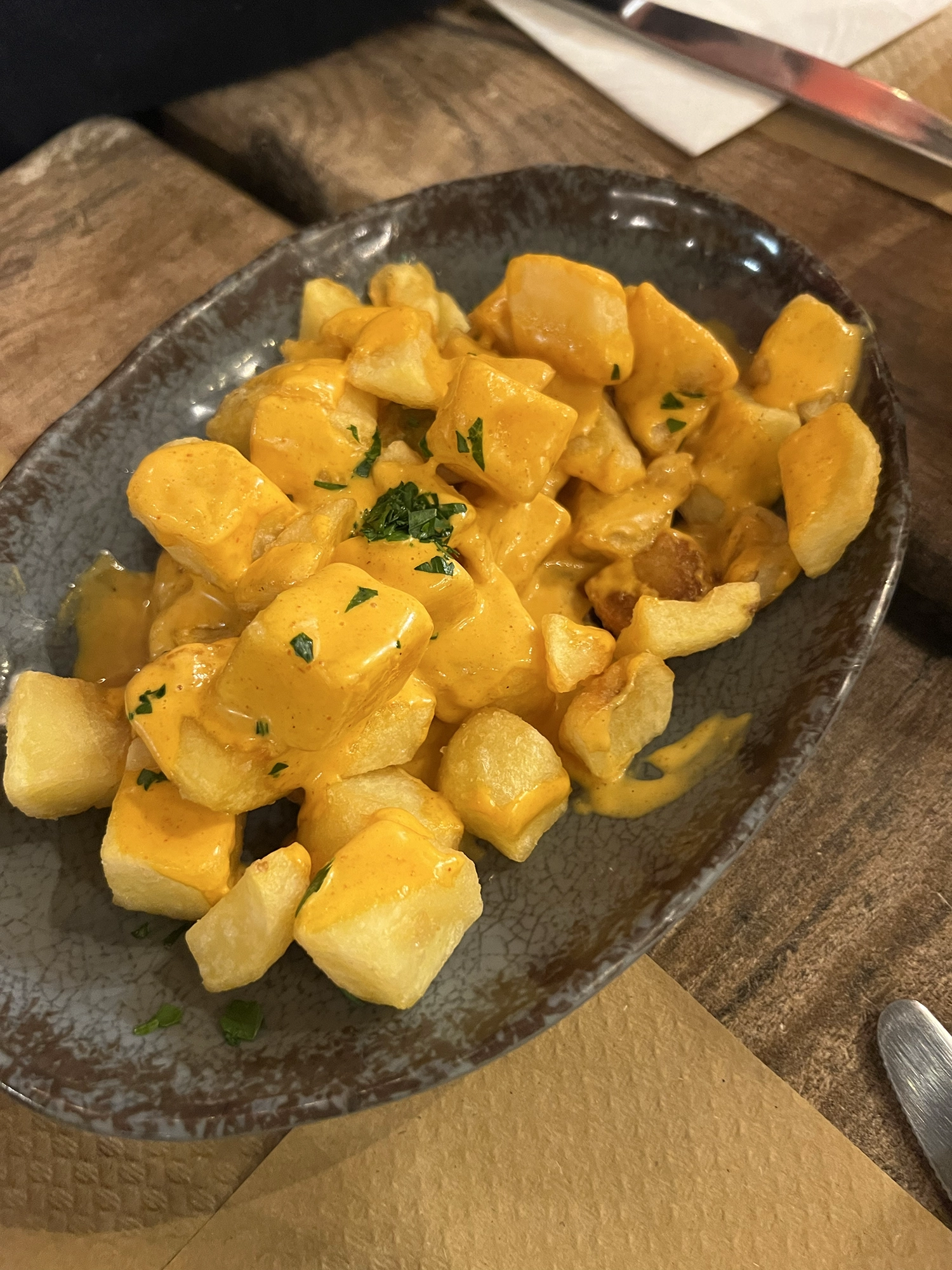 Stegte kartofler serveret med bravasauce og også ofte aioli. Sprøde og krydrede og umulige at stoppe med at spise.