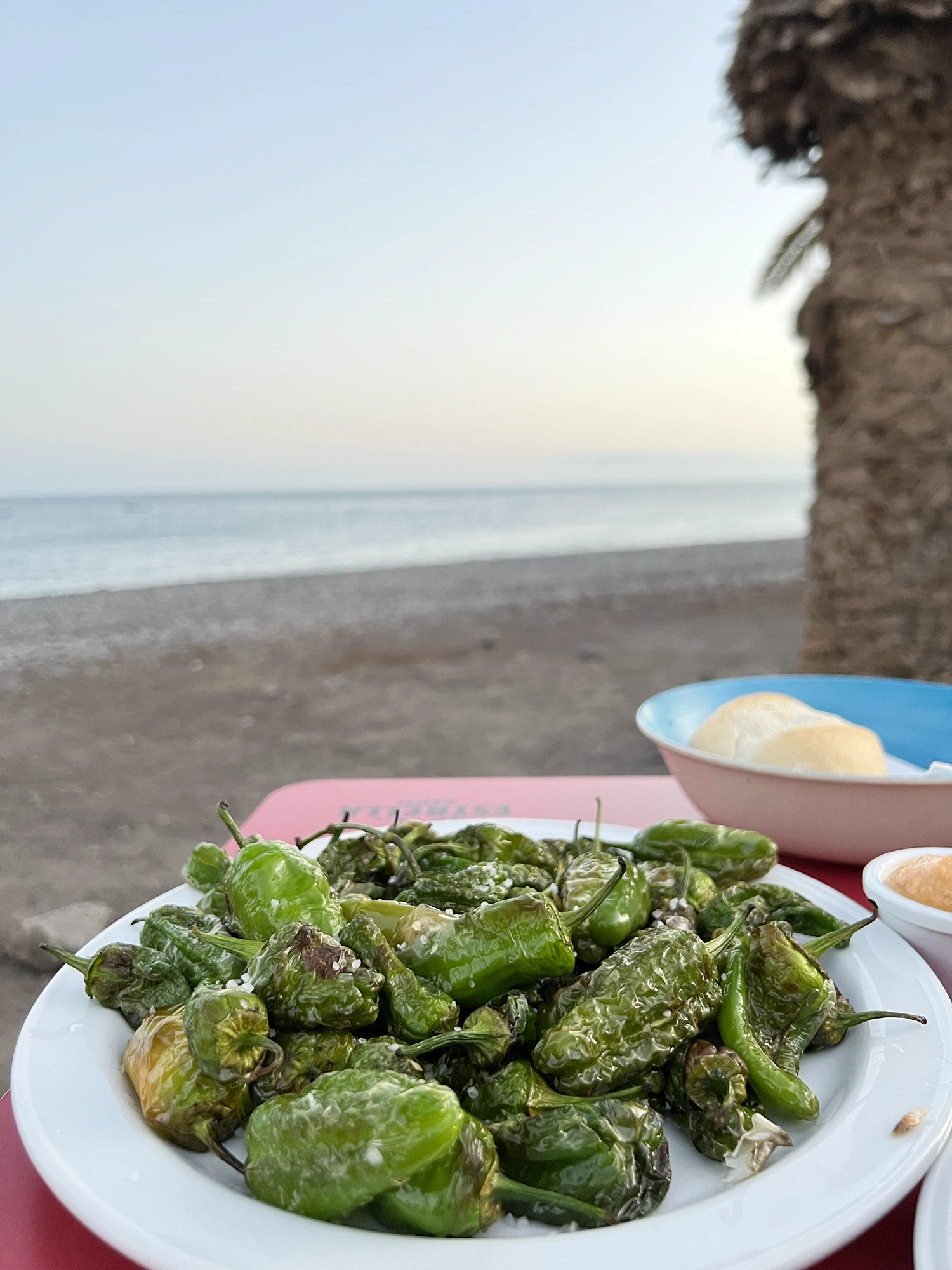 Små grønne peberfrugter stegt på panden og drysset med flagesalt. De fleste er milde, men en gang imellem dukker der en stærk bandit op.
