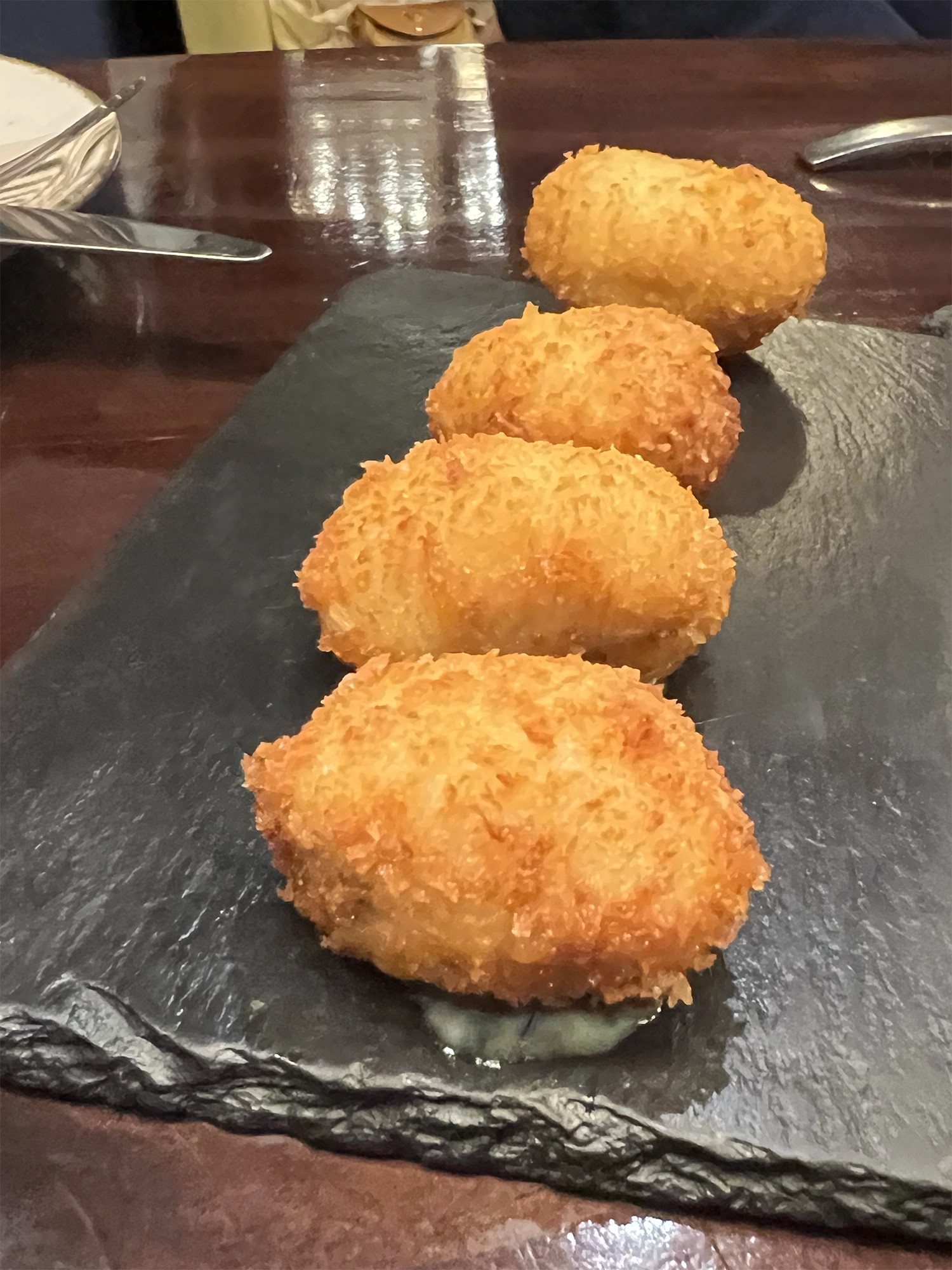 Sprøde udenpå, bløde og cremede indeni. Fyldet varierer fra jamon til svampe og bacalao. En af de mere mættende tapas.