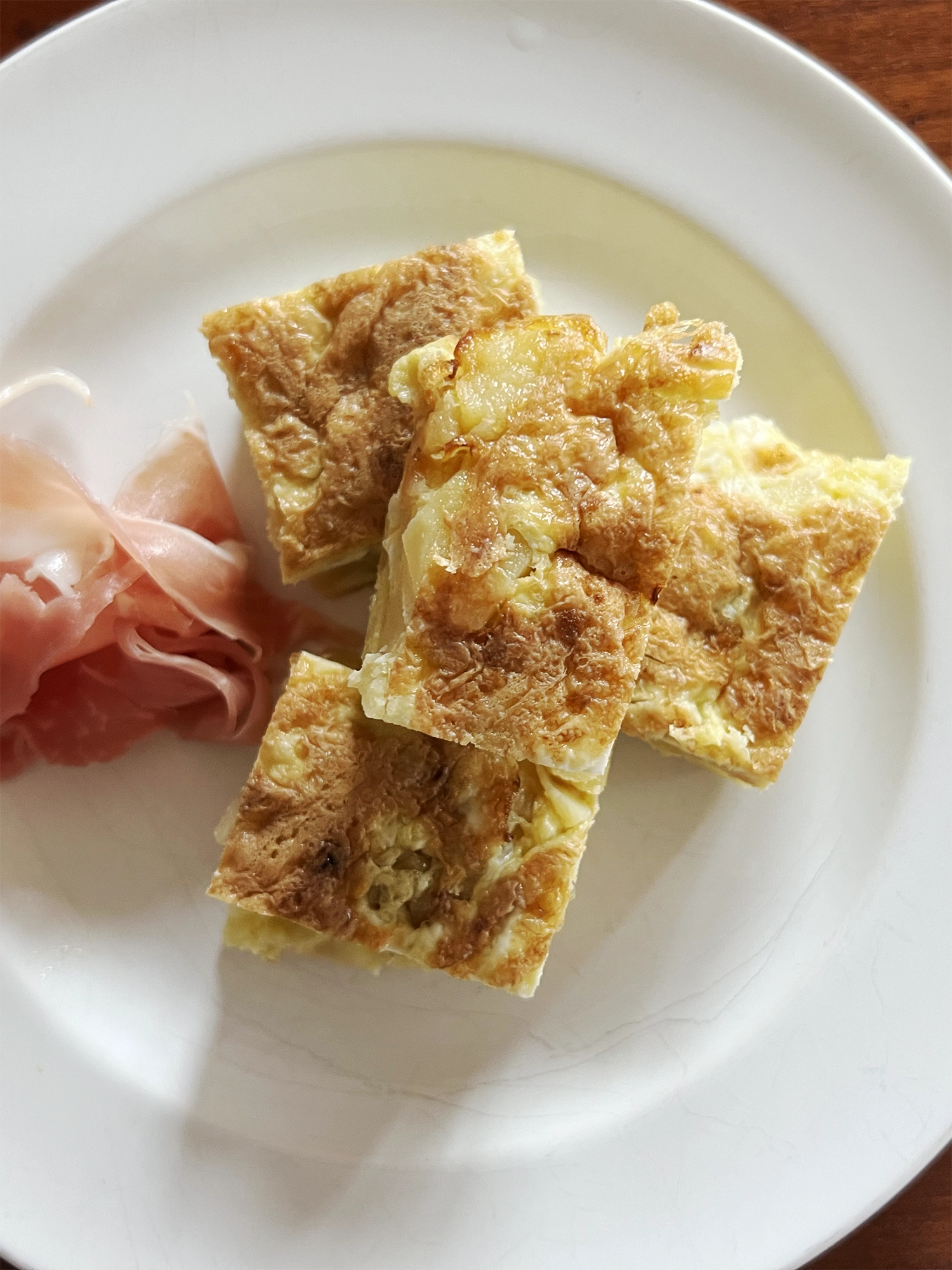 Den spanske omelet med kartofler og løg. Nogle laver den fast og ret tyk, andre næsten cremet i midten. Jeg kan bedst lide den faste, tykke version som ofte serveres i tern.
