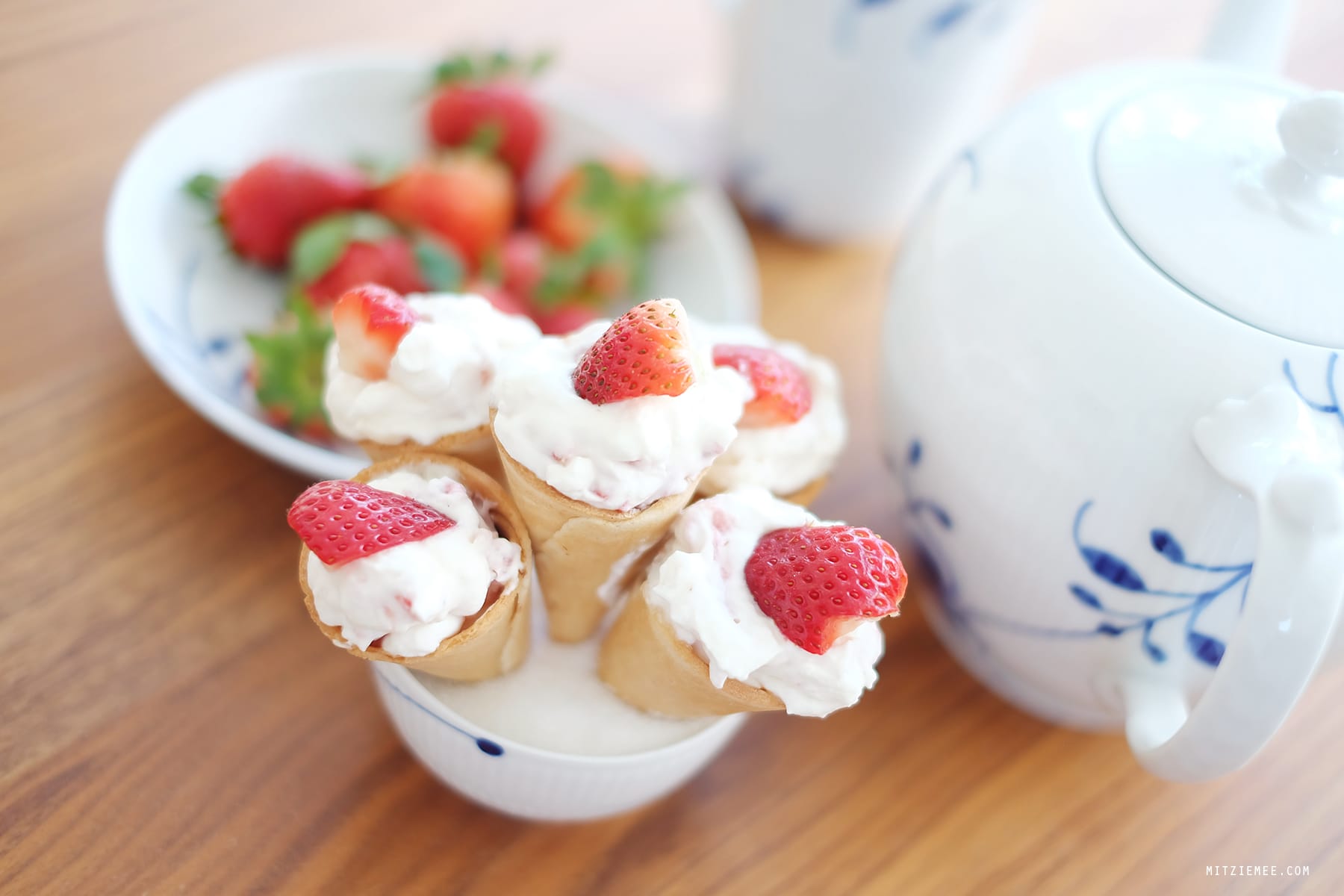 These mini cones with whipped cream are a traditional Danish dessert, and if you cheat a little and use ready-made cones, it doesn’t take more than 10 minutes to prepare. I have mixed the whipped cream with meringues and strawberries, so I guess it makes it a kind of Eton Mess?