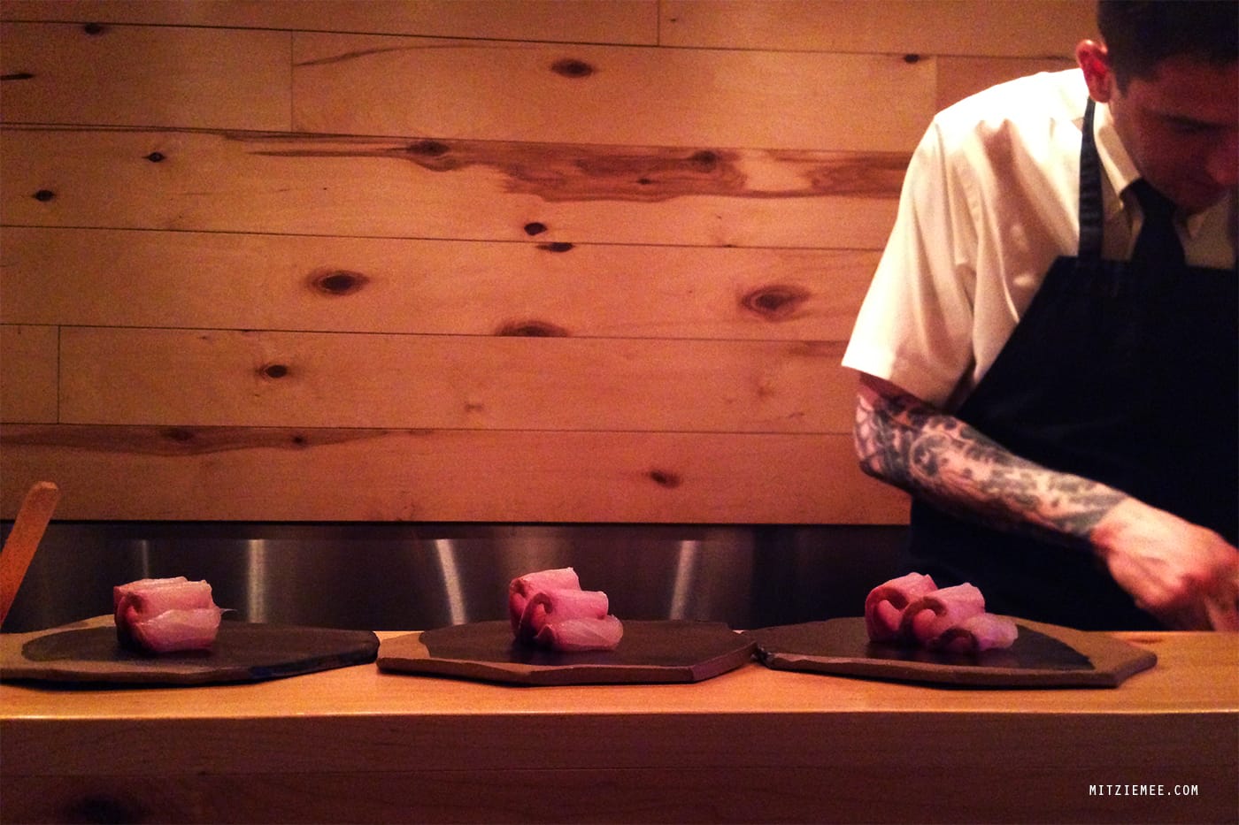 Vi bestilte omakase, som er en menu, som kokken sammensætter, og som er standard på de fleste finere sushirestauranter. Den højlydte gruppe gik efter et kort stykke tid, så vi var de eneste tilbage i restauranten. Vi spurgte derfor, om det var ok, hvis vi fotograferede, og John Daley nikkede. Da vi først fandt vores iPhones frem, så han dog ikke alt for begejstret ud, så vi nøjedes med at tage nogle få billeder af maden.