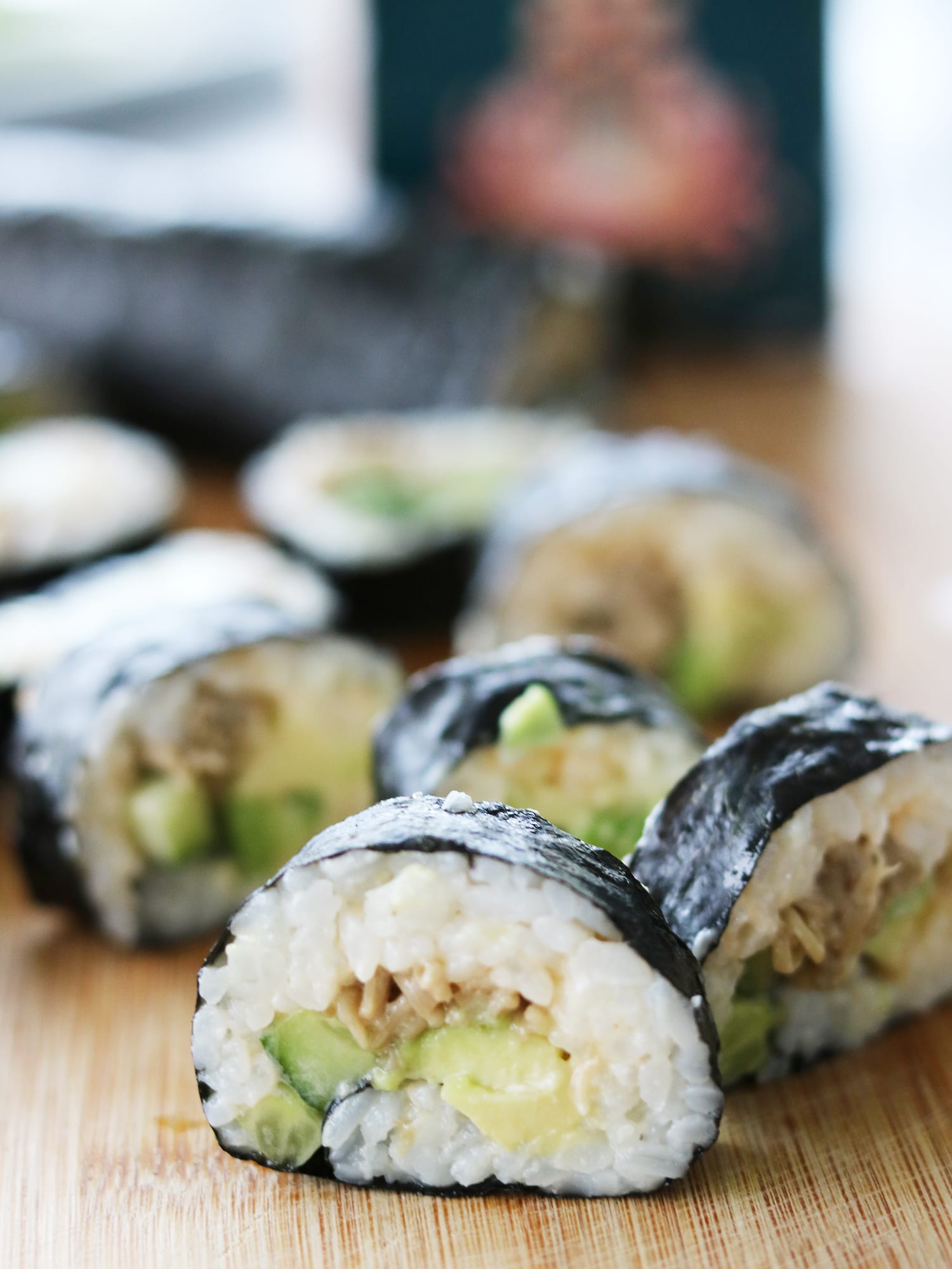 Rolling the maki isn’t as hard as it looks. Just make sure you leave leave a 1-inch border at the top of the nori sheet to seal the roll. My rolls aren’t perfect, but they’re tasty, and that’s what matters:)