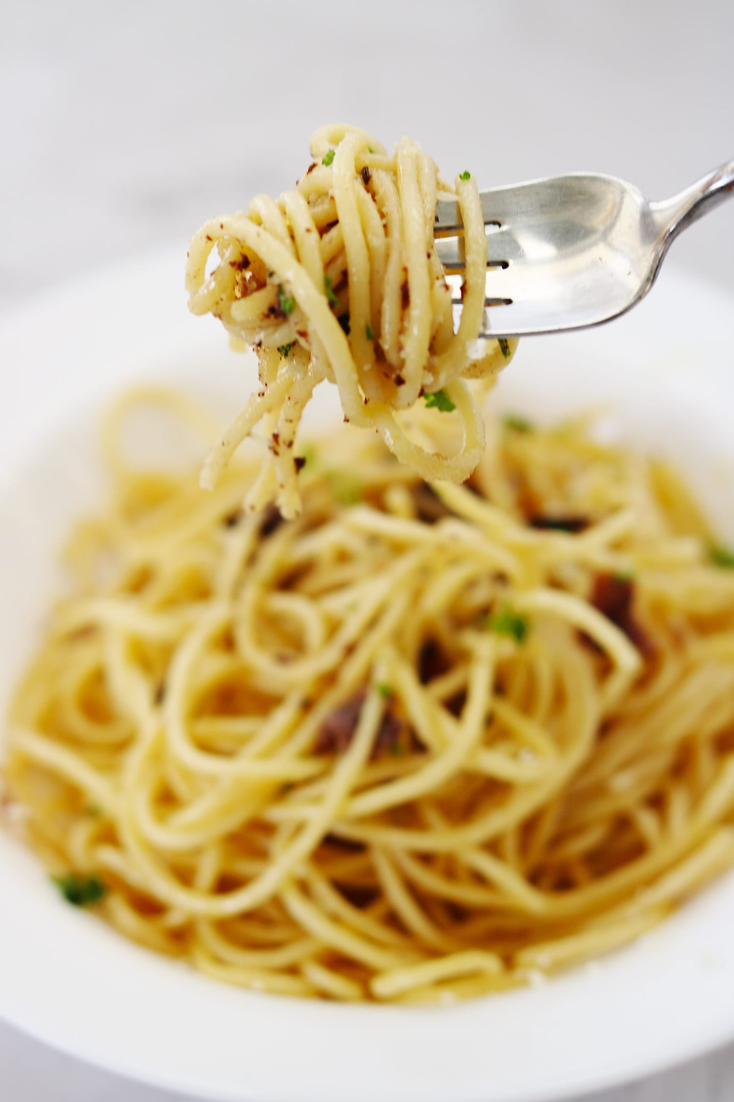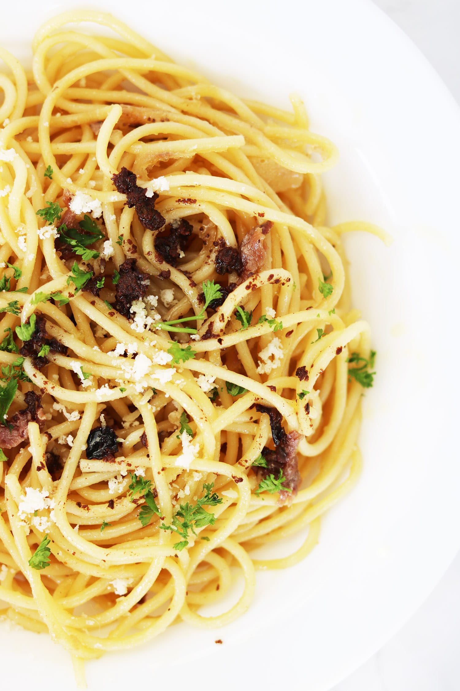 - Add the cooked spaghetti to the skillet with the anchovy+oil mixture. Toss to coat the pasta evenly.