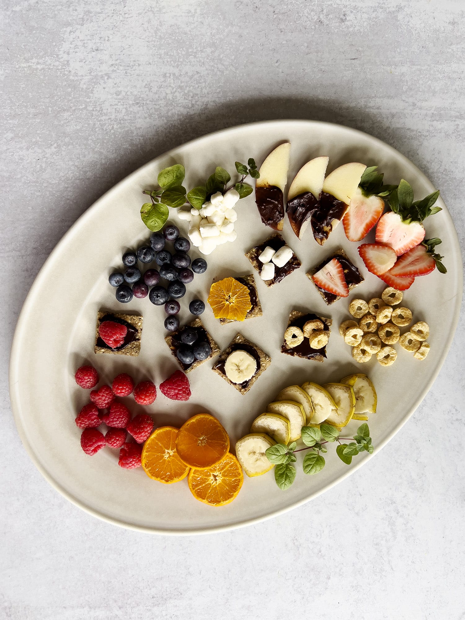 Start by laying out multi-seed crackers on a nice serving dish, then spread each one with a generous layer of the Naked Classic Chocolate Spread. Top the crackers with a colorful mix of fresh fruit and berries. Think juicy strawberries, sweet blueberries, tart raspberries, slices of kiwi, and crisp apple wedges. In the video below, a couple of mini marshmallows have also found their way to the tray, because they look cute and go well with the chocolate flavor, but you can leave them out for a healthier option.