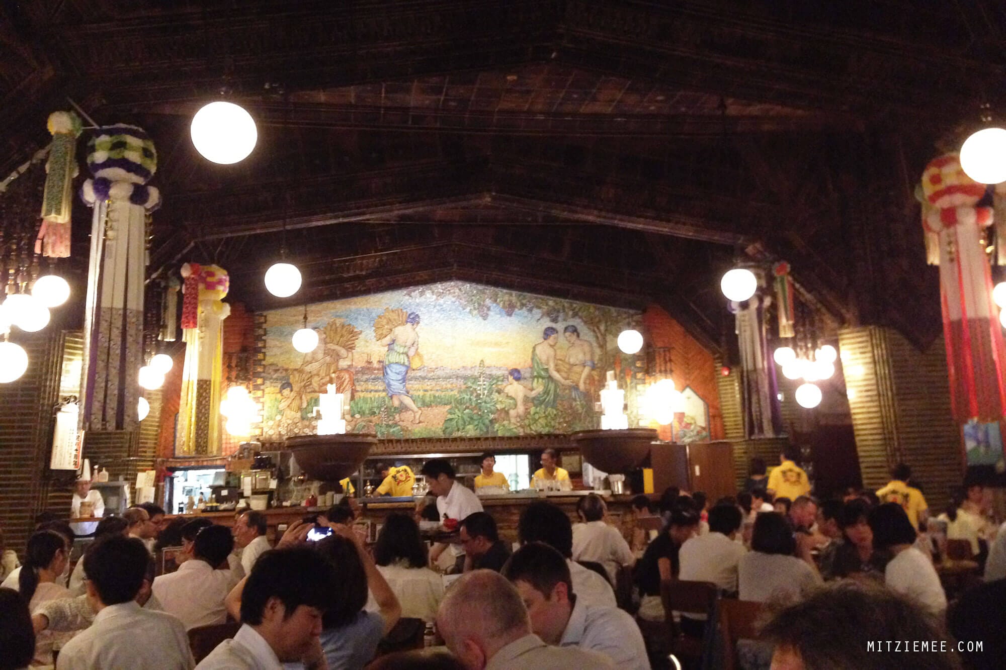 Ginza Lion spans several floors, but it’s in the street level beer hall, the beer drinking takes place. With its high ceilings and wall paintings, the beer hall looks like any other Bavarian beer hall in Germany.