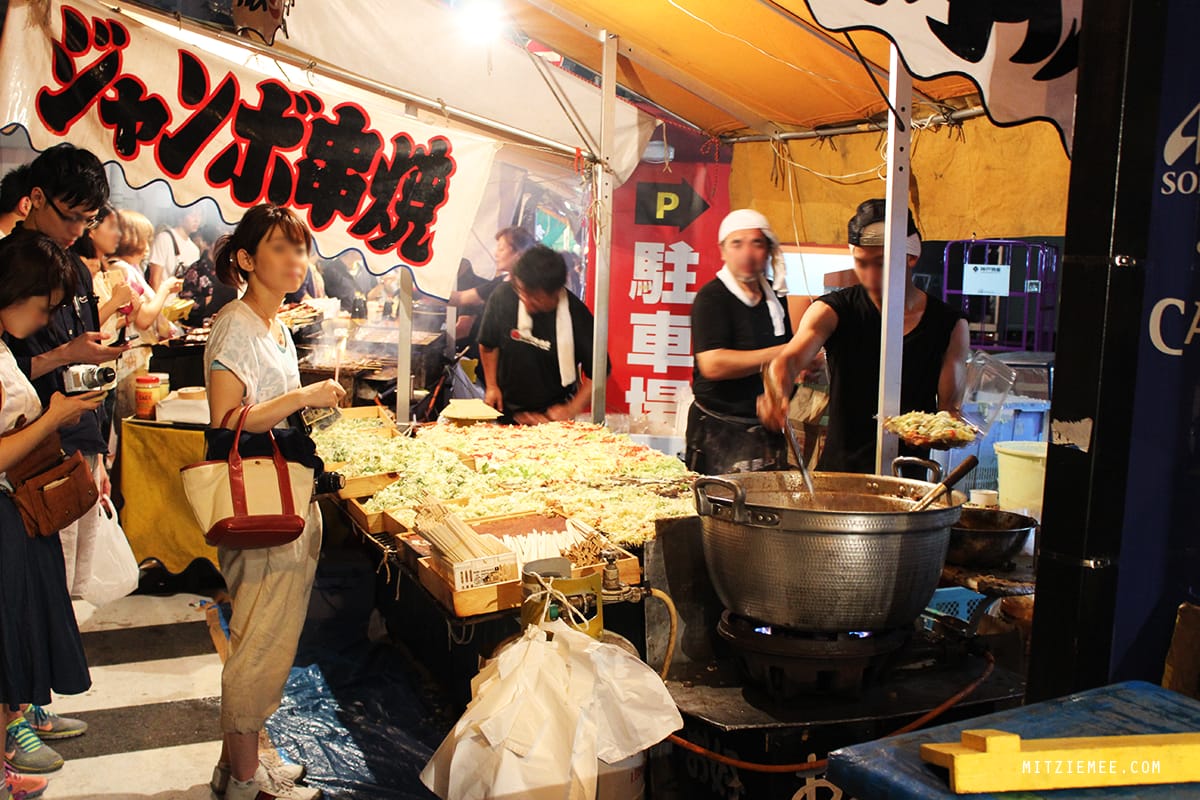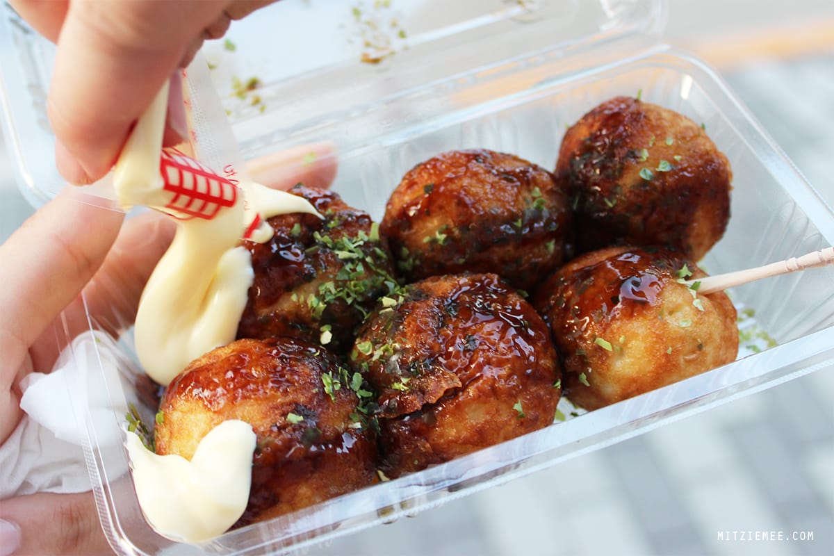 You could buy drinks and snacks from food stalls lining the streets. I got a taste for the salty cucumbers on a stick and yakitori (skewers with chicken). Mari introduced me to a delicious Japanese snack, takoyaki, which are balls made from a flour-based batter stuffed with octopus. You eat takoyaki with mayonnaise and a special, brown takoyaki sauce.