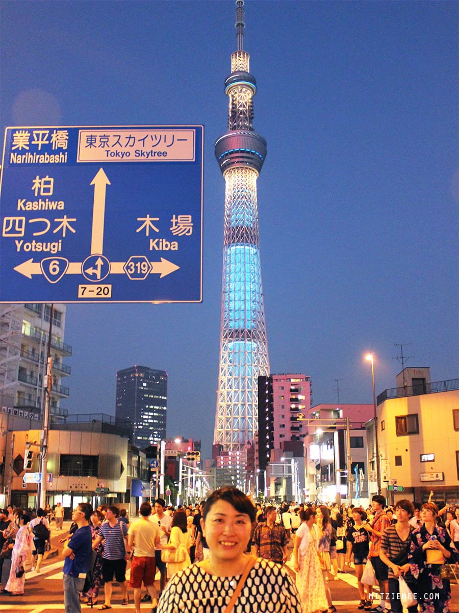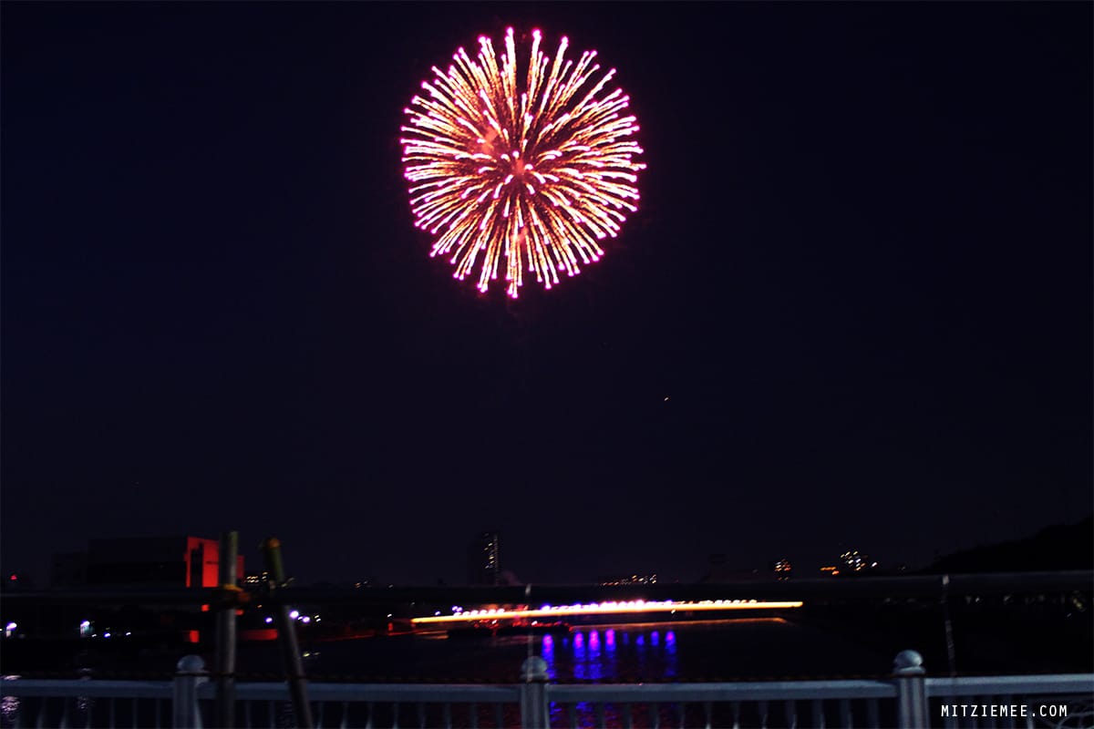 The fireworks were launched from two different places, and you had the best view from the two bridges close to Asakusa station. Though on the bridges, you had to keep on walking. Standing still to take a photo wasn’t allowed. I guess it was because they wanted as many people as possible to enjoy the nice view provided from the bridges.