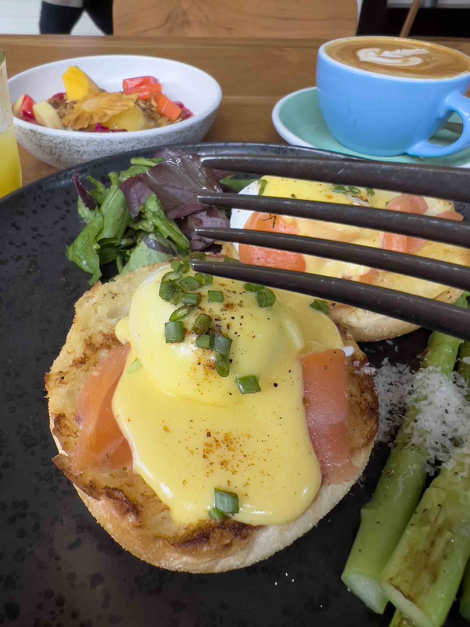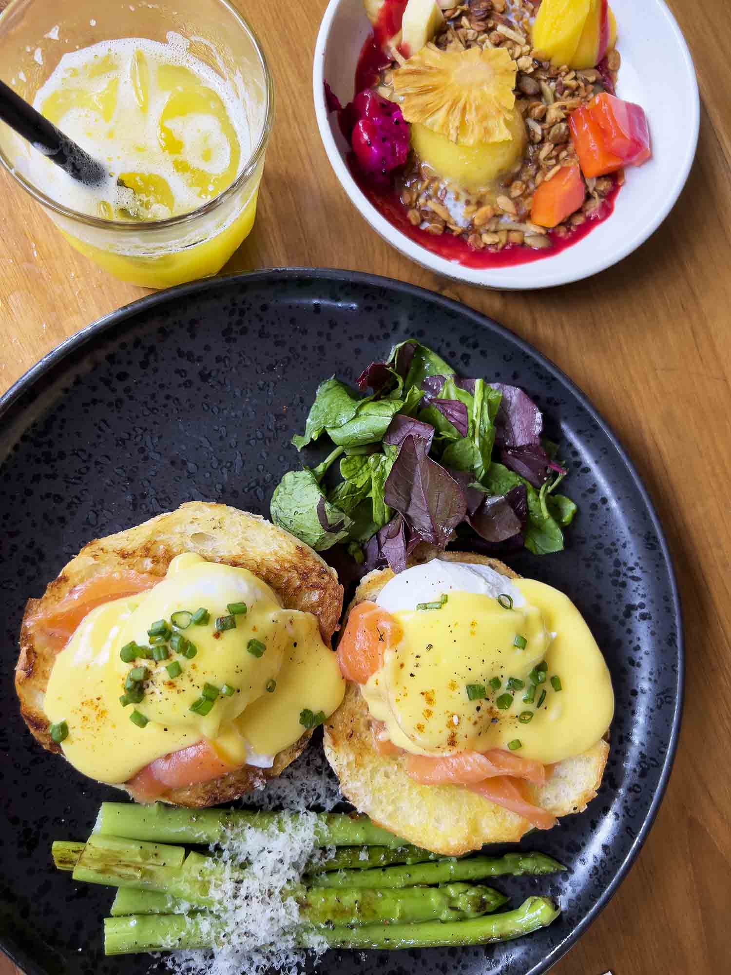 The Benny Brunch is famous throughout Ubud and includes Eggs Benedict, chia pudding with fresh fruit and granola, as well as coffee and juice. There are several different kinds of Eggs Benedict to choose from, but I always end up ordering their Eggs Benny with Gravlax, served on an English muffin with sautéed asparagus on the side.